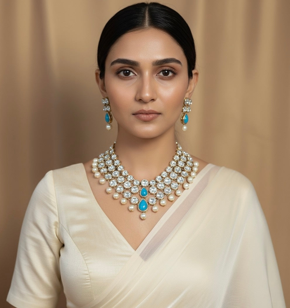 Designed with precision, this jewelry set features brilliant blue Swarovski crystals set in a refined, timeless design. The statement necklace is paired with matching earrings for a coordinated, luxurious look. Lightweight yet radiant, this set pairs beautifully with sarees, lehengas, gowns, or Indo-Western wear, making it a versatile addition to your collection.
