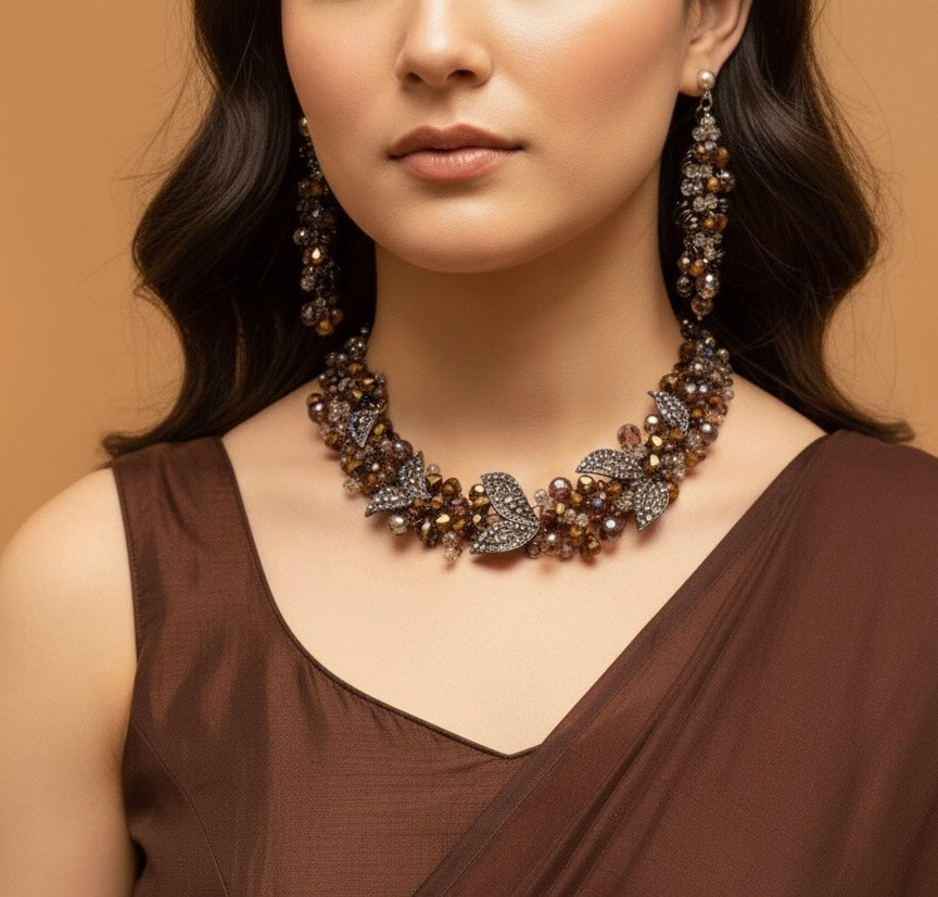Handcrafted with clusters of shimmering brown and golden-toned crystals, this necklace features sparkling leaf-shaped accents encrusted with stones for extra brilliance. Paired with matching cascading earrings, the set adds instant drama and luxury to any outfit. Designed to balance opulence with wearability, it pairs beautifully with gowns, sarees, lehengas, and cocktail attire.