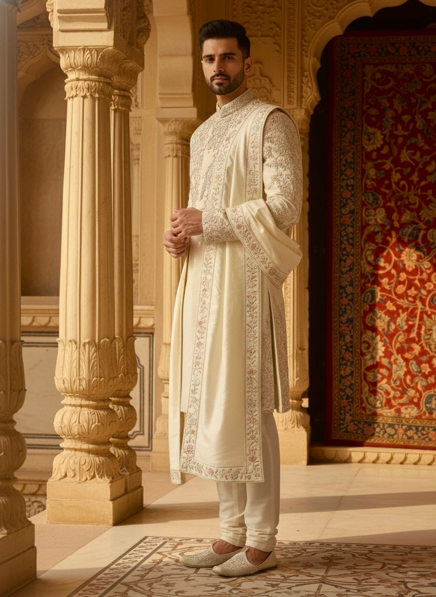 The soft ivory base is elevated by refined embroidery that adds depth without overpowering, making it an ideal choice for the groom who values elegance, tradition, and quiet luxury. Paired with a coordinating stole and tailored for a structured yet effortless silhouette, this sherwani is designed to make a lasting impression from every angle.