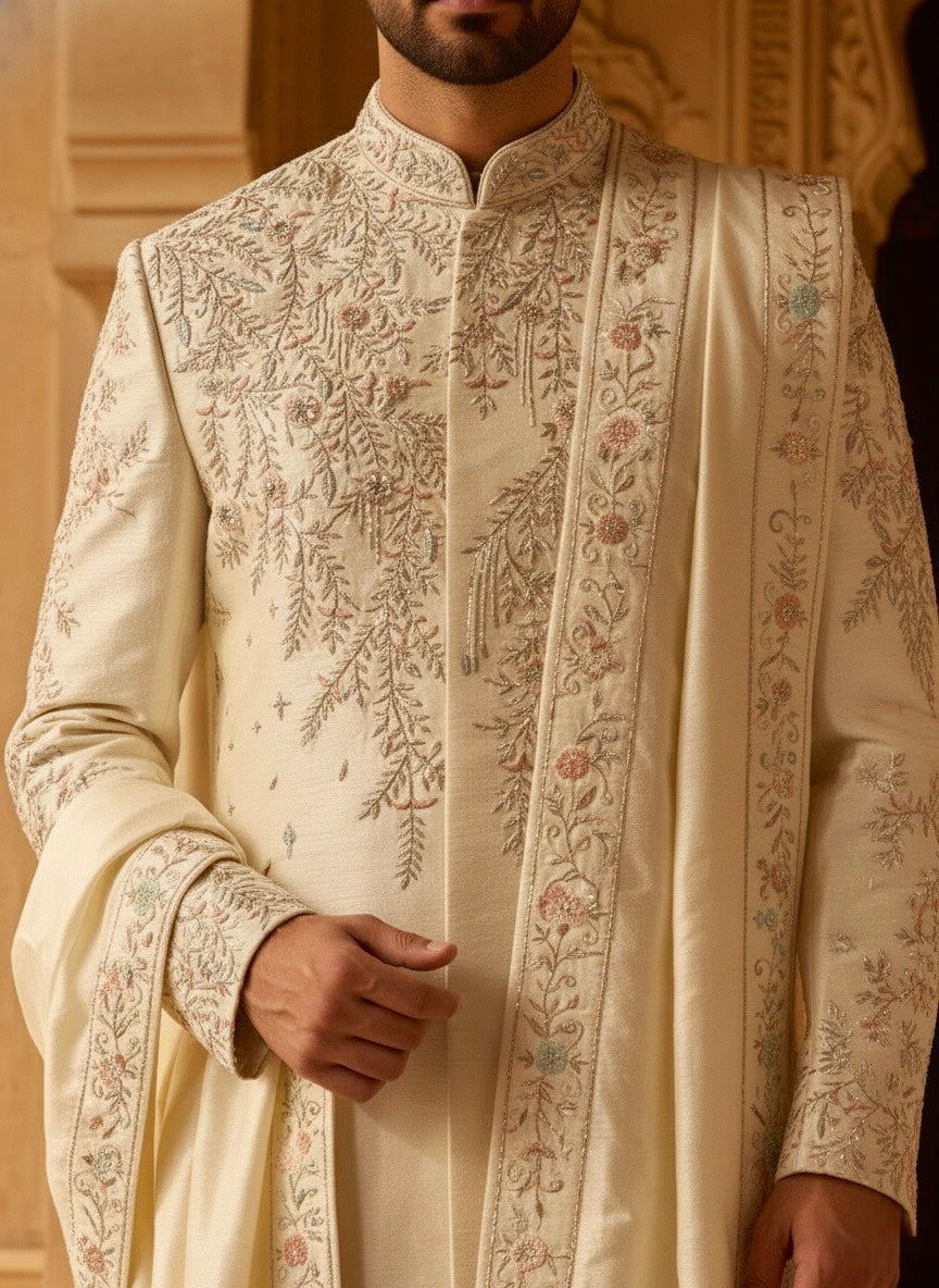 Crafted in luxurious raw silk, this sherwani is a true expression of timeless craftsmanship and understated grandeur. Intricately hand embroidered throughout, the design features delicate floral and vine motifs brought to life with meticulous detailing—each stitch a testament to artisan skill.