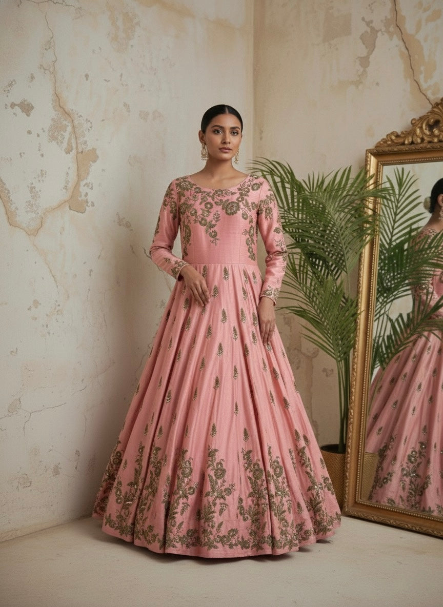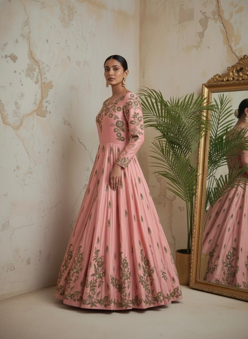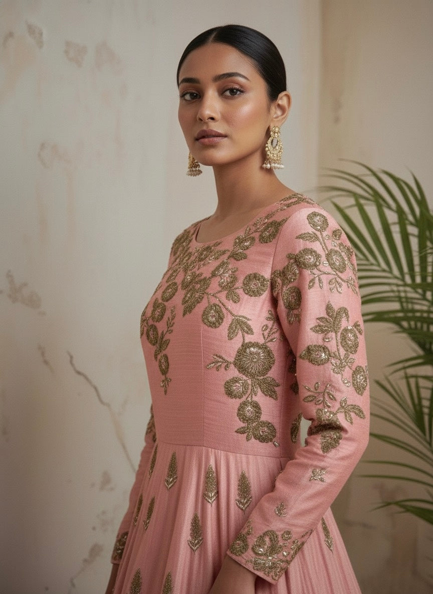 Padmaa blends feminine softness with traditional artistry through exquisite handwork embroidery. The blush pink base is adorned with zari and thread motifs, with a flare embellished in scattered butis and a beautifully detailed neckline.