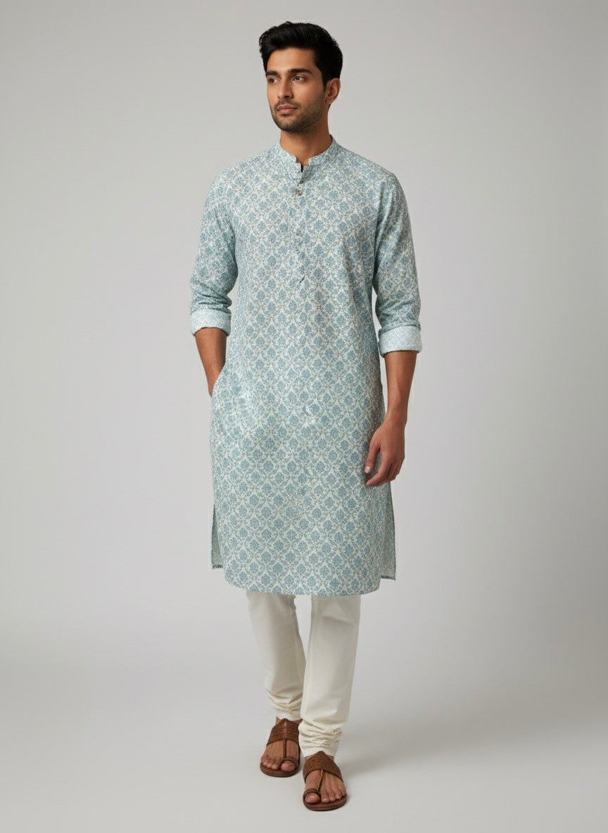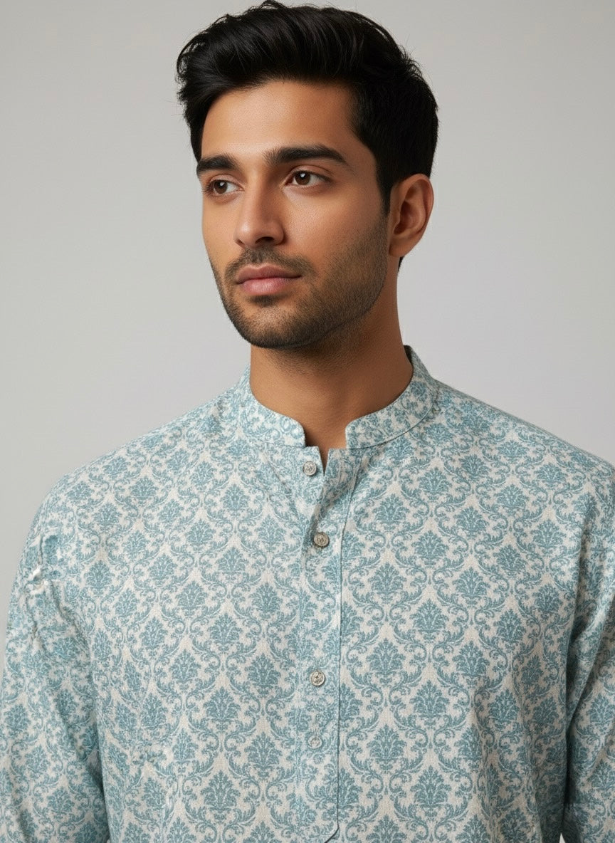 Cool, minimal, and effortlessly chic — the Blue Printed Cotton Kurta Set brings a fresh update to traditional menswear. The subtle blue print on soft cotton fabric gives it a sophisticated yet relaxed vibe, perfect for summer weddings, festive lunches, or intimate gatherings. Lightweight and breathable, this set combines comfort with timeless elegance.