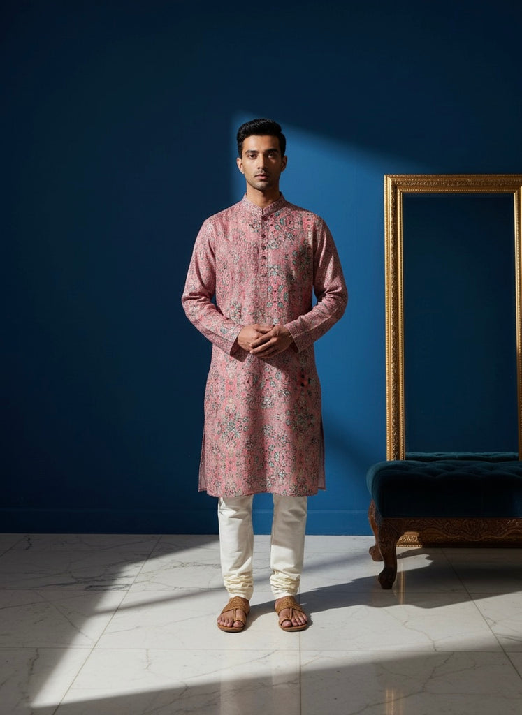 Opulent yet understated, the Pink Embroidered Kurta Set is crafted in a soft silk-blend base adorned with intricate thread embroidery and delicate sequin highlights. The all-over print creates a rich, textured effect, while the subtle shimmer of sequins adds a festive touch. Perfect for mehendi functions, daytime weddings, or celebratory gatherings, this kurta set strikes the ideal balance between comfort and grandeur.