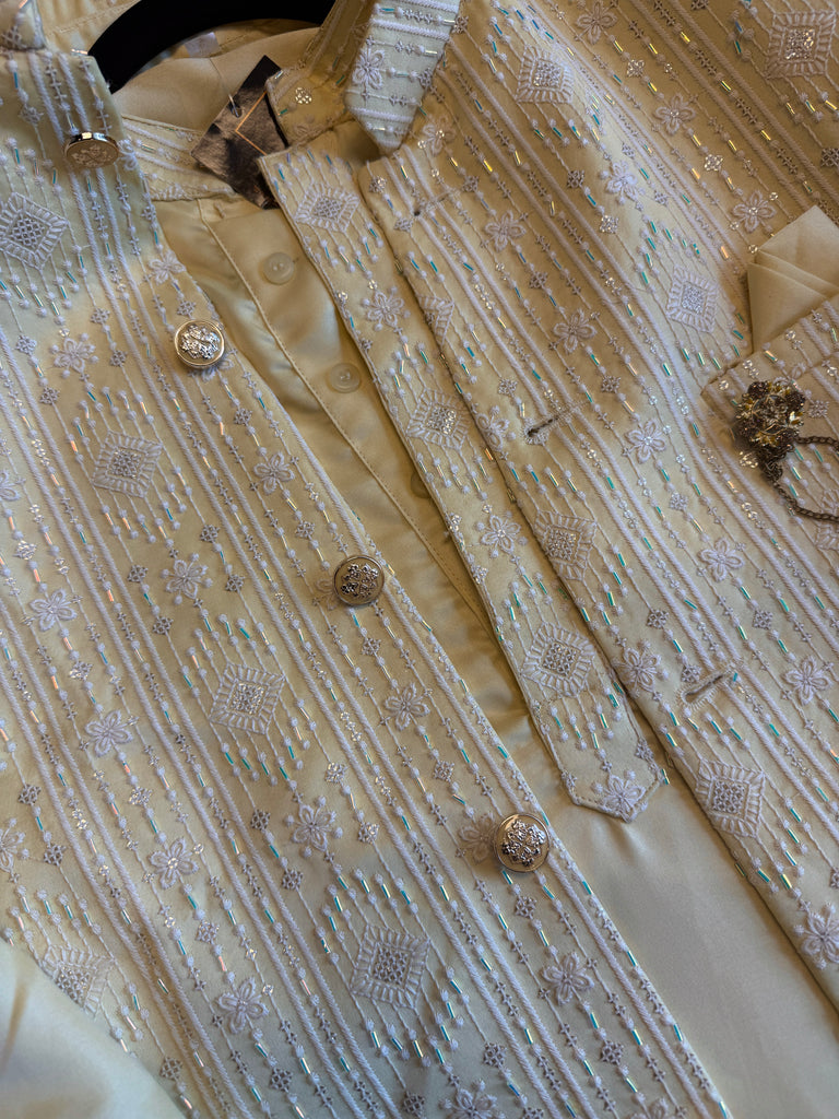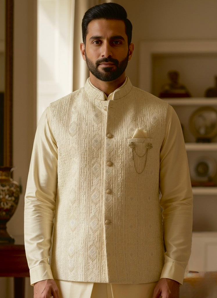 Elegant and timeless, this butter-yellow vest kurta set exudes understated sophistication. The silk-blend Nehru jacket features intricate tonal thread embroidery highlighted with delicate sequin and bead accents, paired with a matching butter-yellow kurta and straight pants. Finished with embroidered buttons and a statement brooch chain, this ensemble blends traditional craftsmanship with contemporary charm — ideal for daytime weddings, festive celebrations, or formal gatherings.