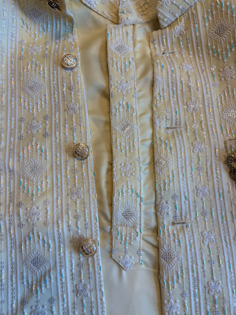 - Set Includes: Embroidered Nehru jacket, kurta, and pants