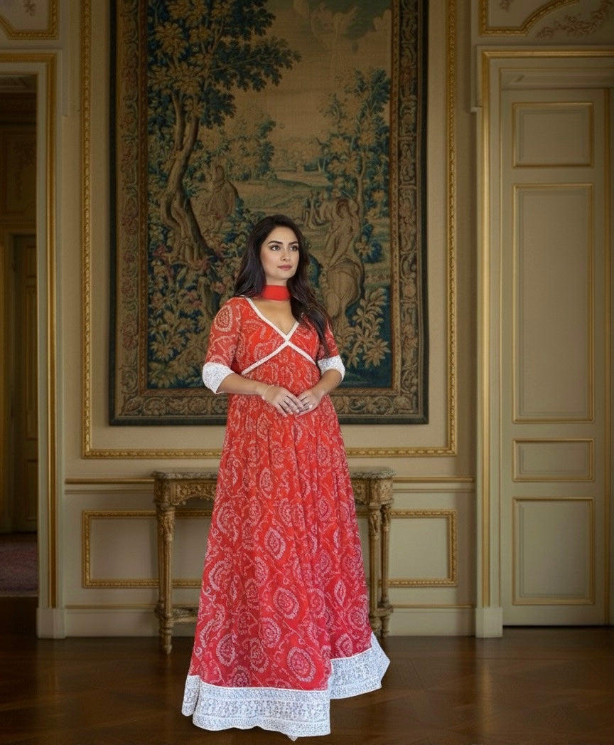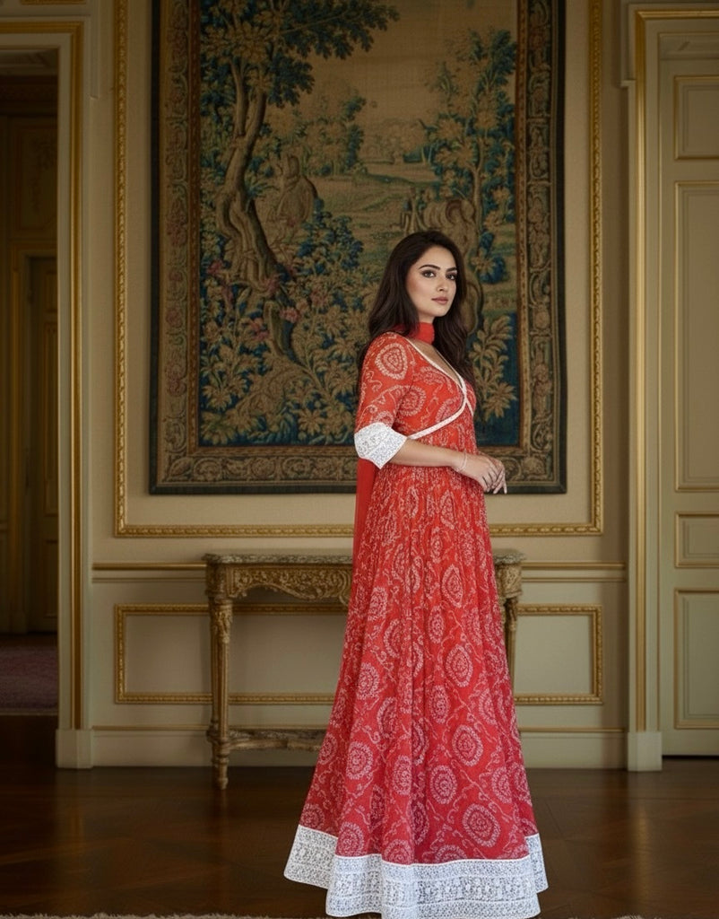 Bright, elegant, and timeless—this Vermilion Paisley Anarkali makes a striking impression. The intricate paisley motifs are framed beautifully with white lace borders along the neckline, sleeves, and hemline, creating a fresh and feminine contrast. Lightweight and flowy, this piece exudes effortless grace, ideal for brunches, pujas, or intimate celebrations.