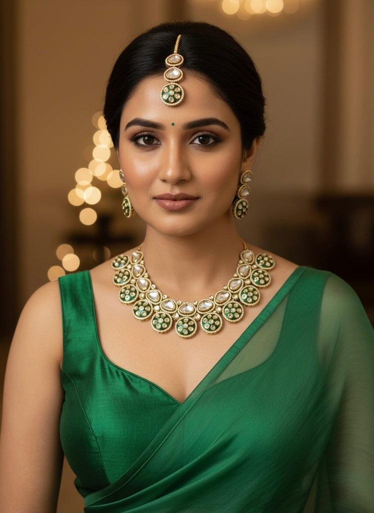 A masterpiece of timeless elegance, this handcrafted Polki jewelry set showcases uncut Polki stones set against rich green enamel detailing. Each piece—necklace, earrings, and maang tikka—exudes regal sophistication with its intricate gold-plated finish and heritage-inspired design. Perfect for brides, bridesmaids, or anyone seeking an elevated traditional look that blends luxury and craftsmanship.