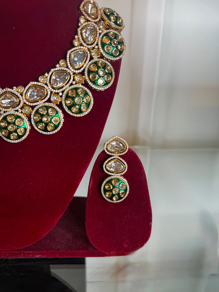 Pair this Polki set with an emerald or ivory ensemble to accentuate its royal green detailing and radiant glow.