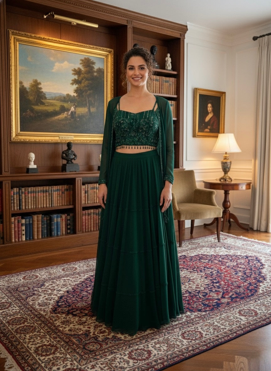 A statement of modern elegance, this emerald green three-piece lehenga set is crafted in soft georgette and intricately hand-embroidered with Resham threads, beads, pearls, and cutdana. The fitted blouse features delicate craftsmanship and a flattering neckline, paired with a flowy skirt that moves with effortless grace. The sheer embroidered jacket adds a contemporary edge, making this ensemble perfect for festive celebrations, sangeets, and evening occasions.
