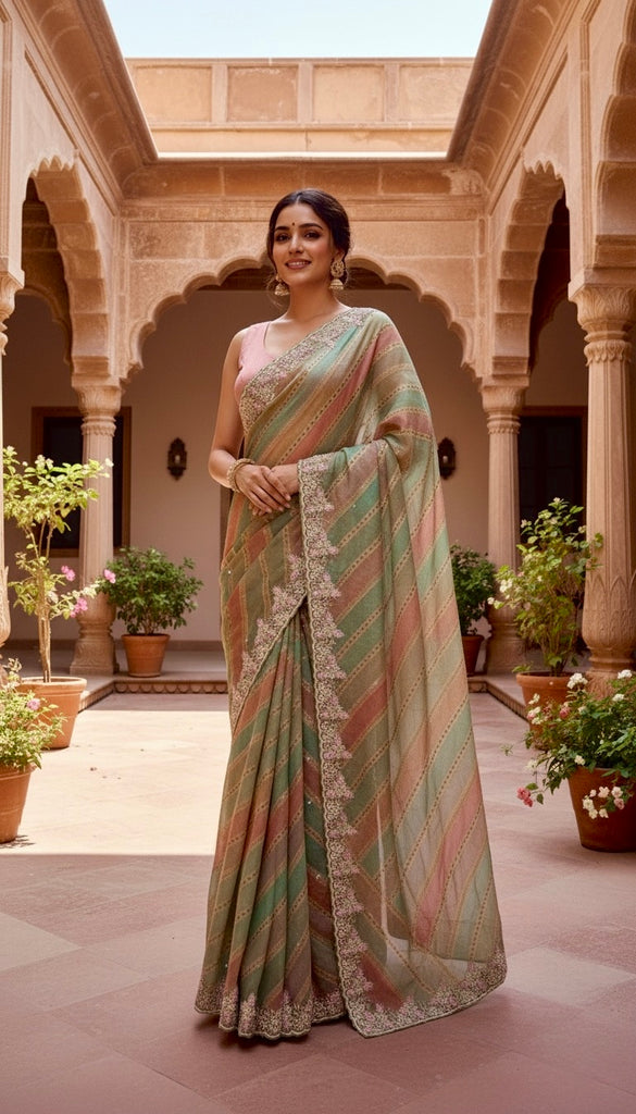 - Hand Embroidered border featuring pearls, sequins & floral motifs