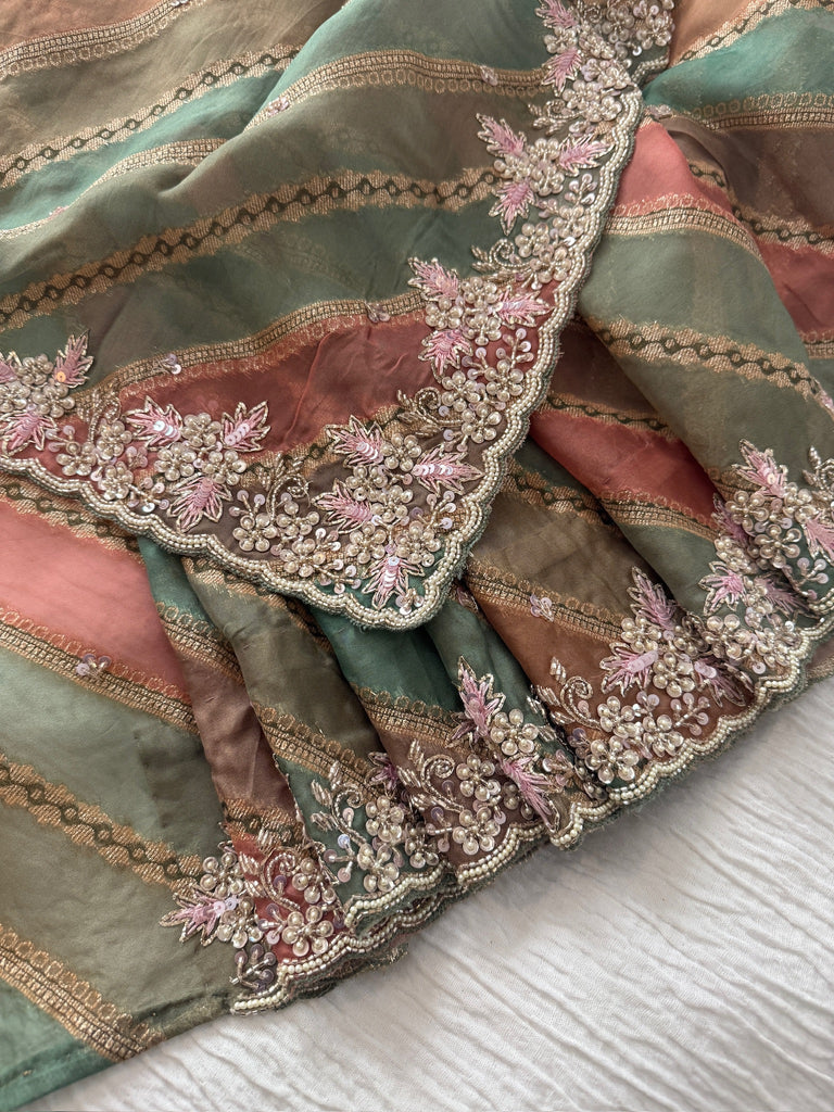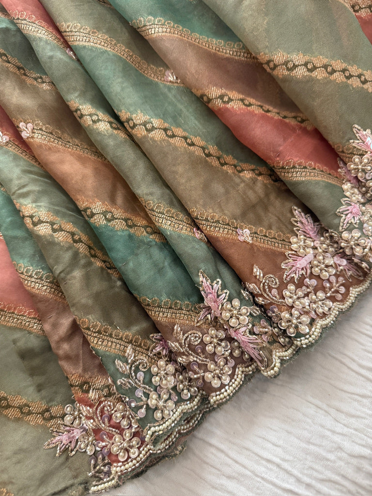 Rich and striking, this green and rust Rangkat Banarasi Saree showcases contrasting hues woven seamlessly with golden zari motifs. The border is beautifully embellished with floral hand embroidery, pearls, and sequins, adding depth and sophistication to the drape. A timeless piece that exudes heritage luxury, it’s the perfect choice for wedding guests, festive nights, or elegant celebrations.