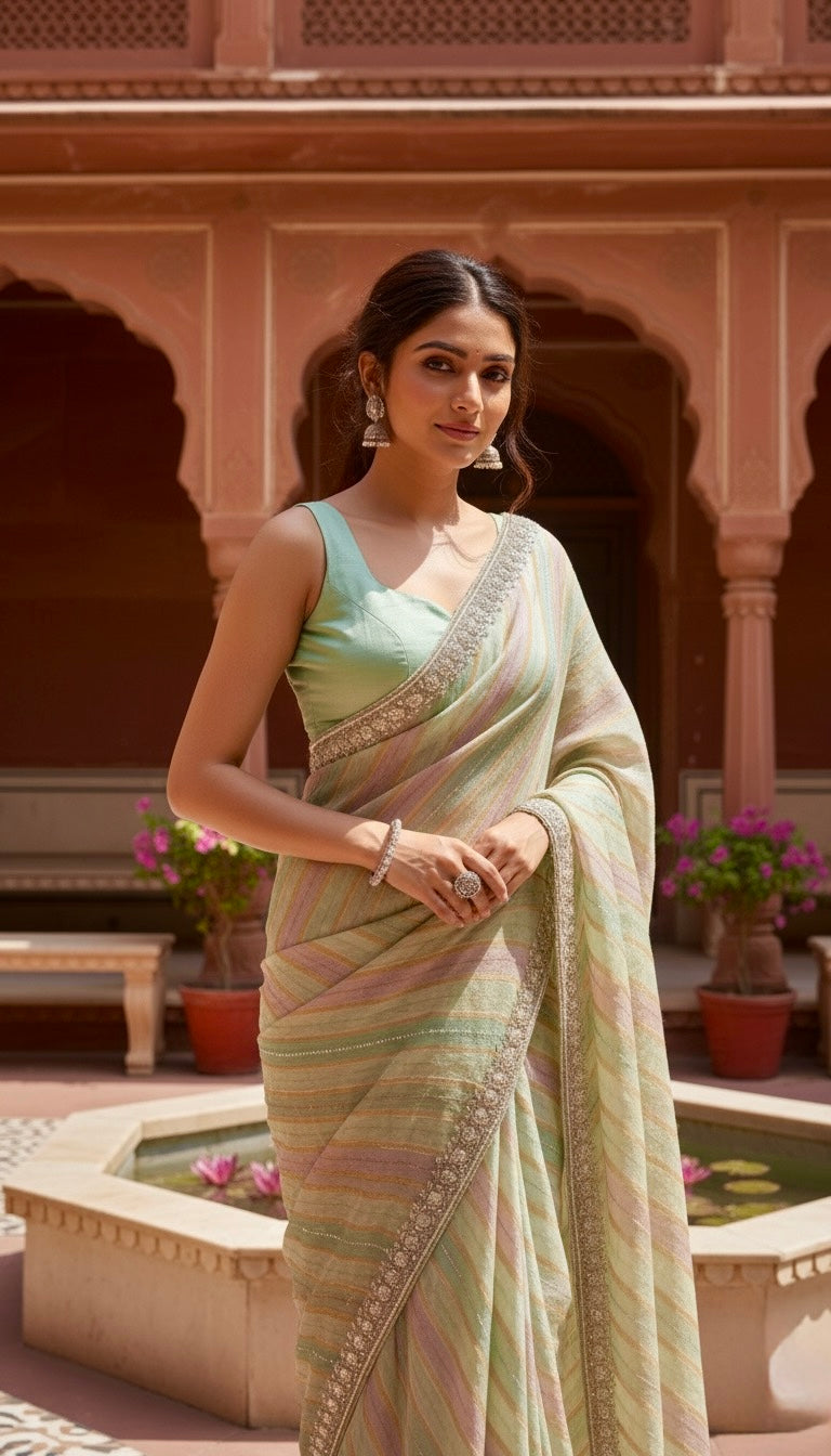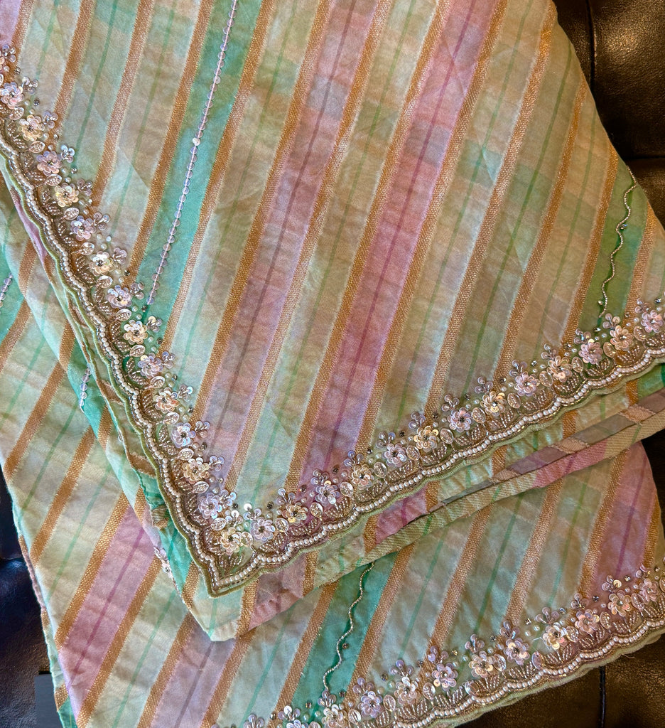 Soft and romantic, this pastel Rangkat Banarasi Saree blends hues of mint, lilac, blush, and gold into a dreamy striped weave. The border is finished with dainty floral embroidery, sequins, and pearls, making it shimmer gracefully with every drape. This saree strikes the perfect balance between modern pastel tones and traditional Banarasi artistry — ideal for receptions, festive evenings, and intimate celebrations.