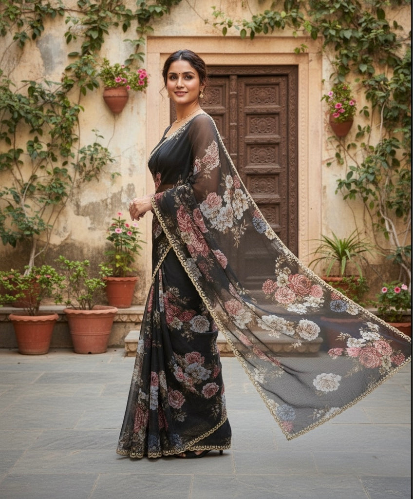 Dramatic and timeless, this black organza saree is highlighted with vibrant multicolor floral prints and a luxurious golden border. Perfect for evening soirees, receptions, or festive nights, this saree makes an effortless statement of style.