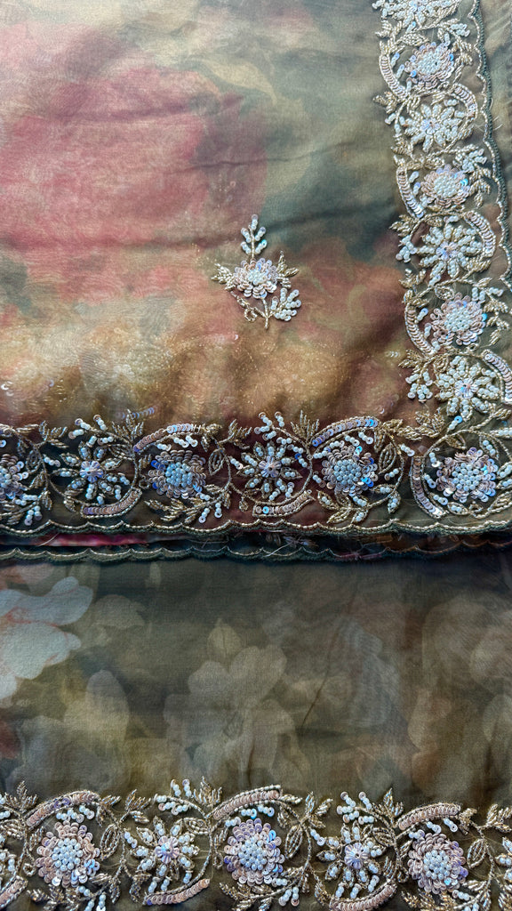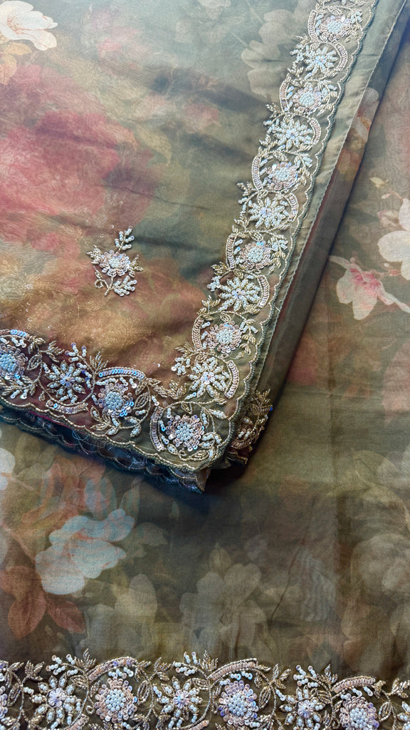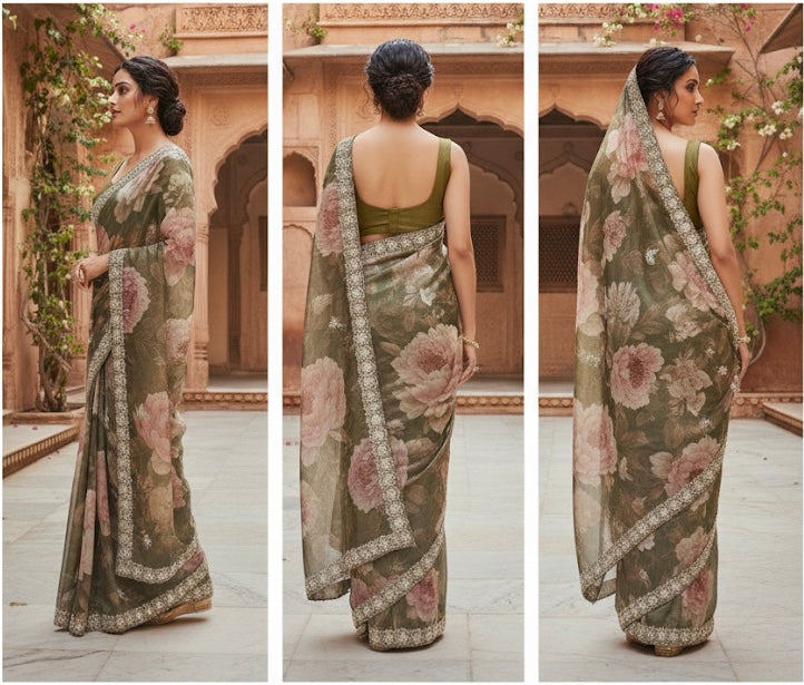 This olive green organza saree brings together earthy tones with soft floral accents. Its shimmering hand-embroidered border adds just the right amount of elegance, while the sheer, breathable fabric makes it perfect for day-to-night wear. Each saree comes with a blouse piece that can be tailored and customized.