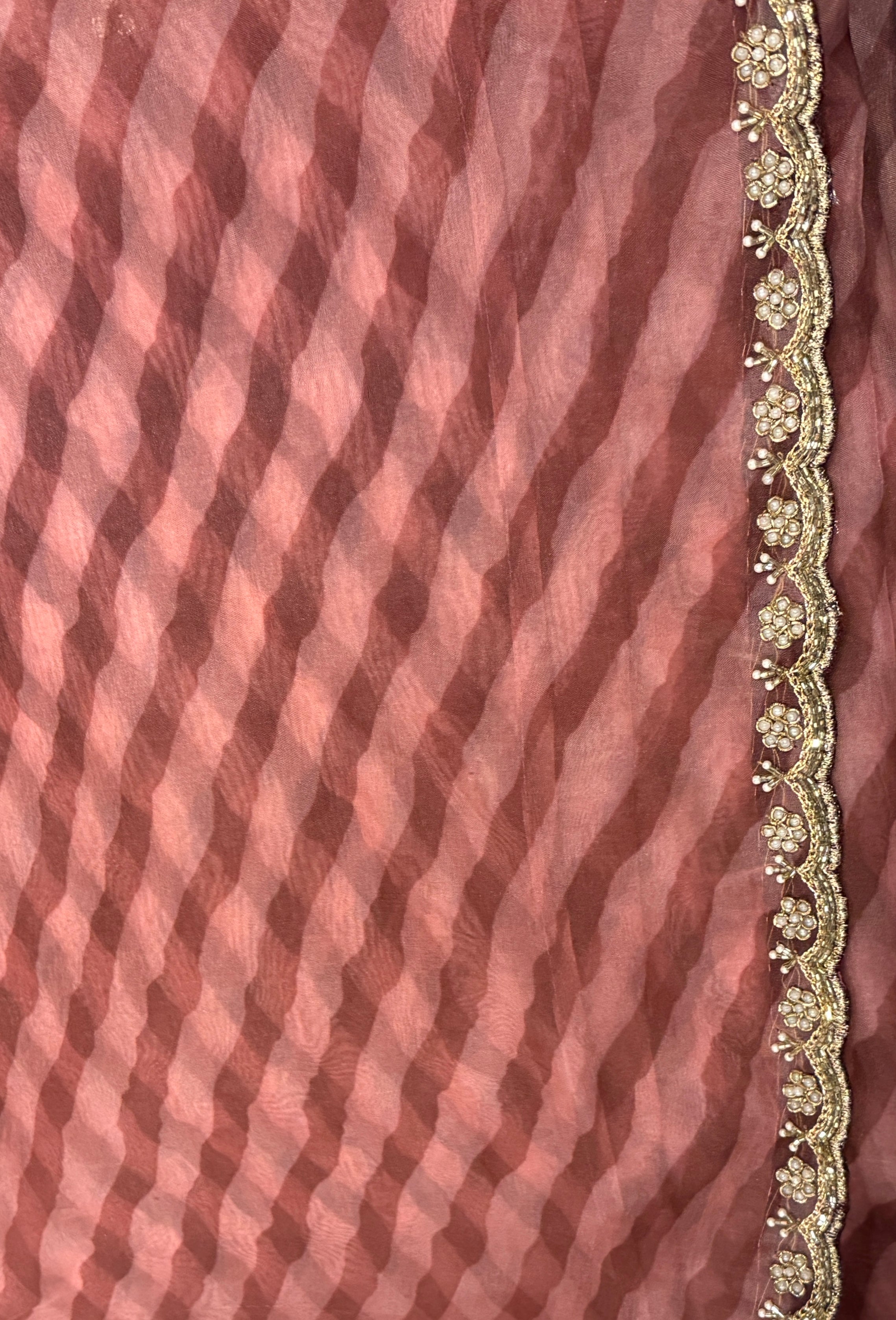 Elegant and ethereal, this blue-lavender organza saree blends cool hues with a touch of shimmer for a look that’s both modern and timeless. The sheer striped fabric drapes beautifully, creating a fluid and airy silhouette. Finished with a scalloped border intricately hand-embroidered with pearls, sequins, and cutdana, this saree exudes refined sophistication — perfect for cocktail events, festive gatherings, or elegant daytime celebrations.