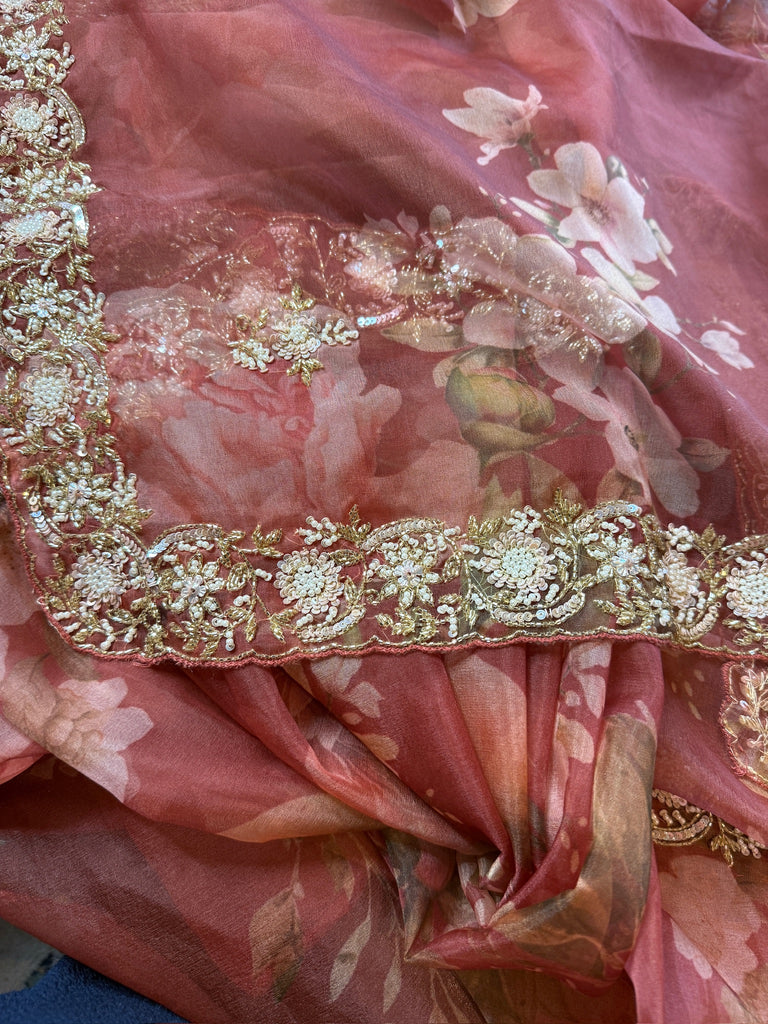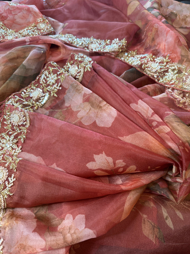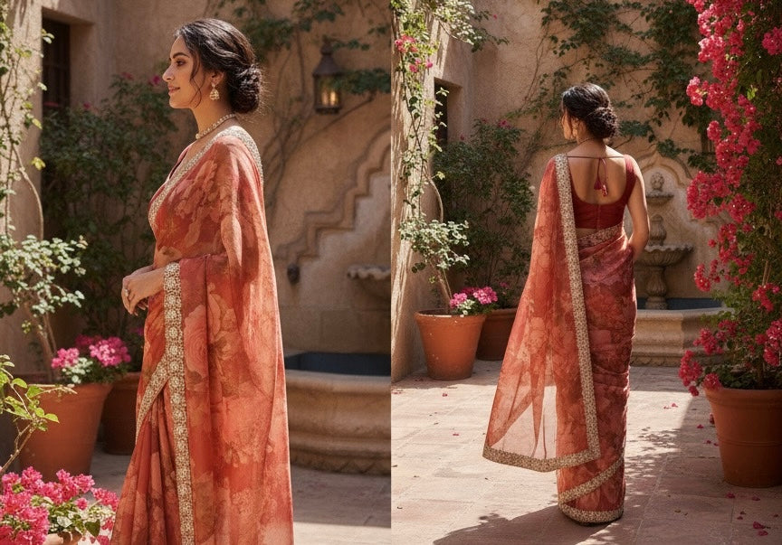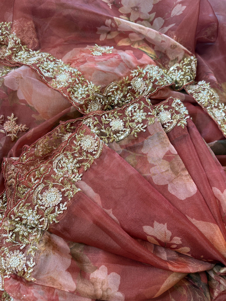 A statement piece in warm rust orange this floral organza saree is adorned with oversized blooms and finished with an intricately handworked border. The lightweight, airy fabric drapes effortlessly, making it ideal for festive occasions, weddings, or evening soirées. Comes with a matching blouse piece that can be designed and customized to your style.