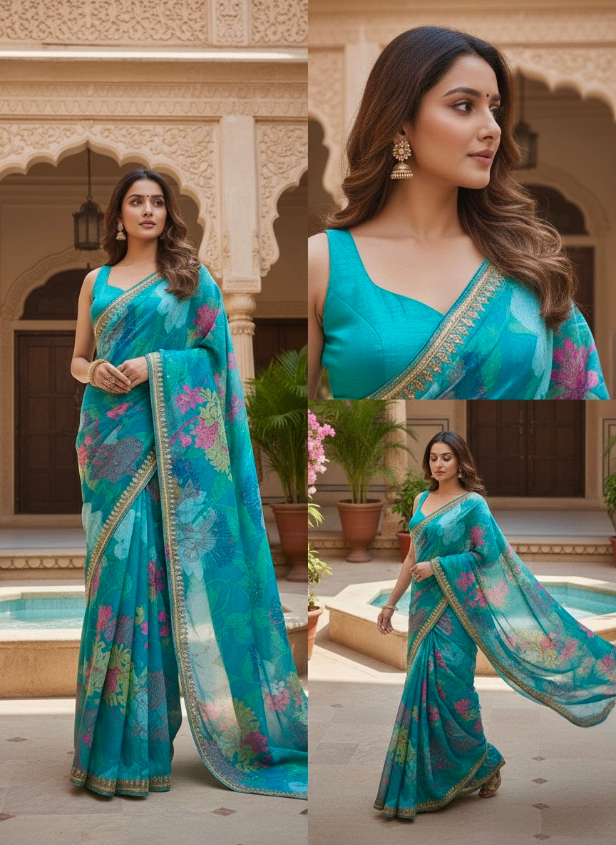 Fresh, vibrant, and effortlessly elegant — this turquoise satin saree features a striking floral print in hues of fuchsia, lime, and aqua, making it a perfect choice for both daytime and evening occasions. The smooth satin fabric drapes beautifully, offering a soft sheen and luxurious fall. The saree is finished with a delicate hand-embroidered border in zari and bead detailing, adding just the right touch of festive shimmer.
