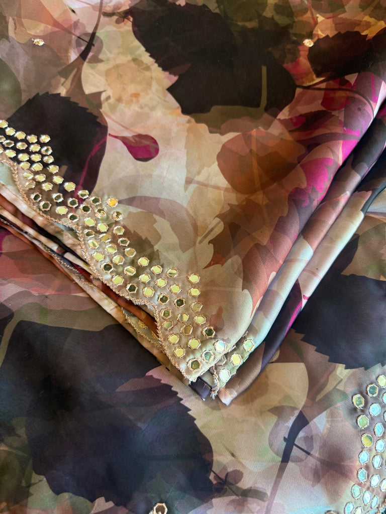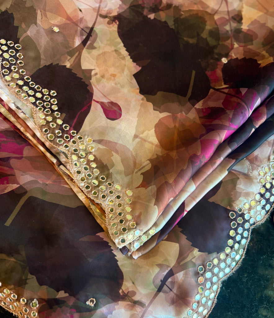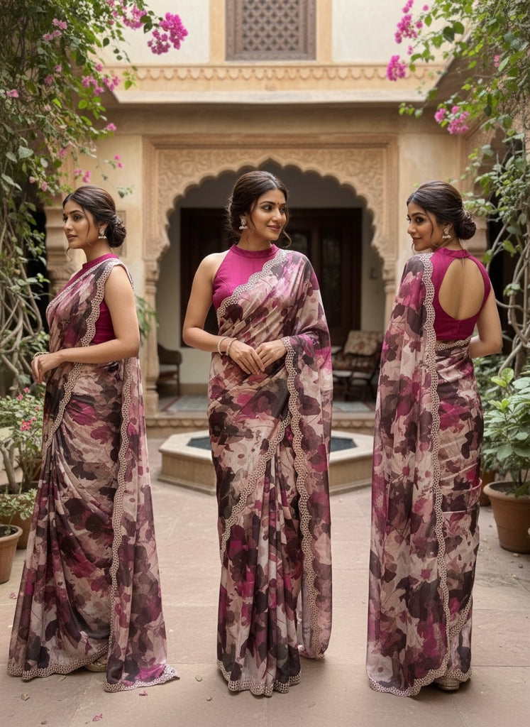 Romantic and graceful, this wine and pink floral satin silk saree is designed to turn heads. The soft satin silk fabric glides beautifully, featuring a blend of mauve, rose, and wine-toned floral prints. An intricately detailed scalloped border adds a touch of charm and richness. With its modern color palette and fluid drape, this saree is ideal for festive occasions, cocktail evenings, and special celebrations. Comes with a blouse piece that can be stitched and customized to your preference.