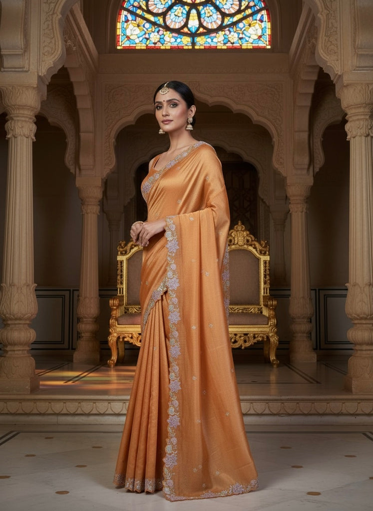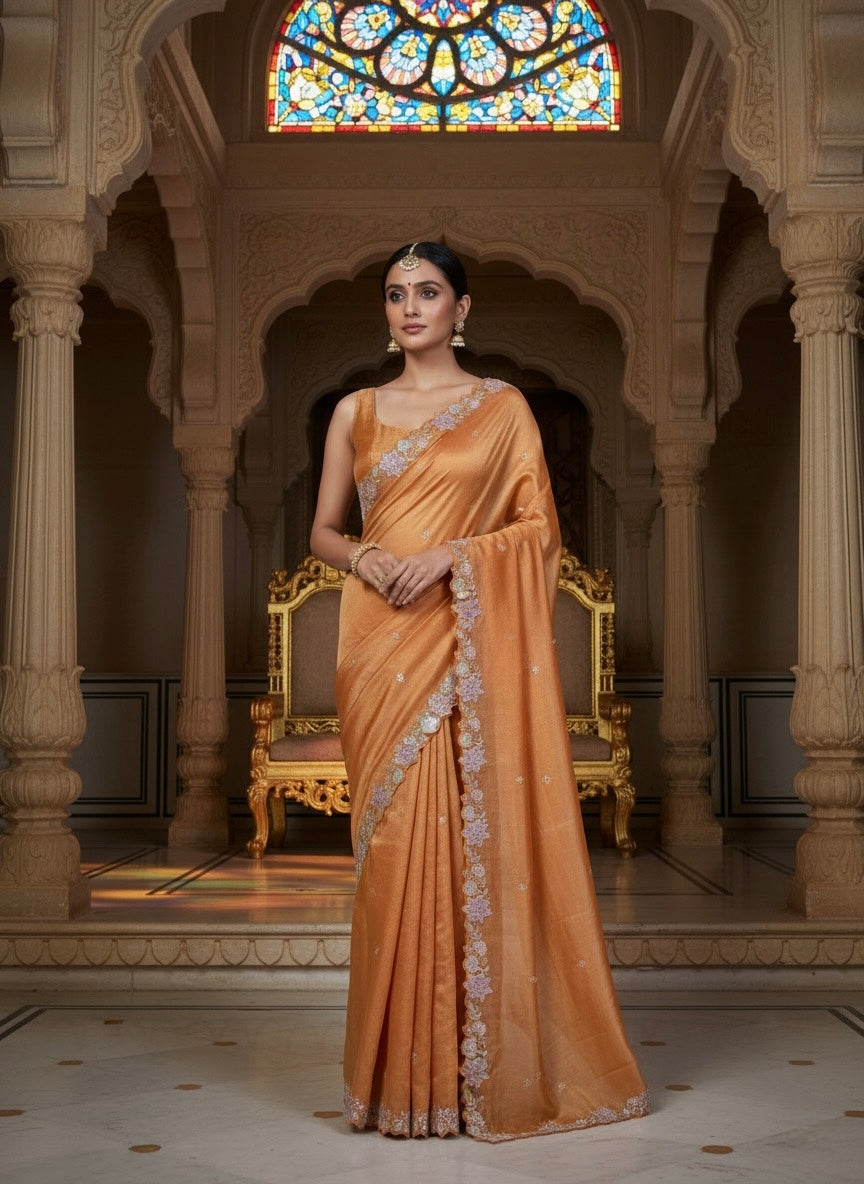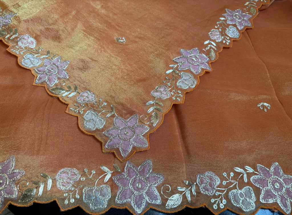 Rich and sophisticated, this Rust Tissue Organza Saree showcases detailed floral embroidery in metallic tones that add a subtle shimmer to its earthy hue. Lightweight yet luxurious, it’s perfect for wedding festivities or evening events.