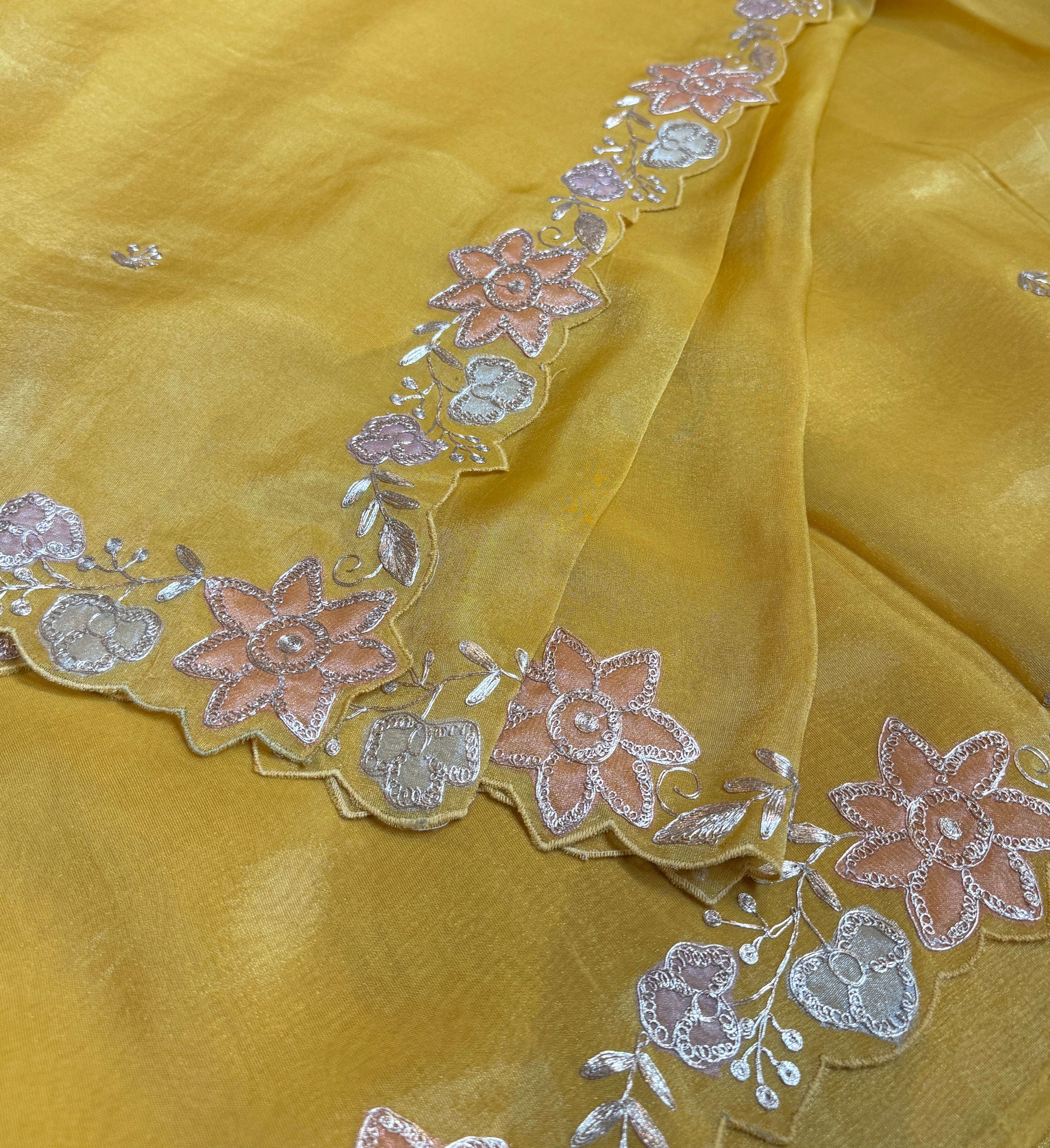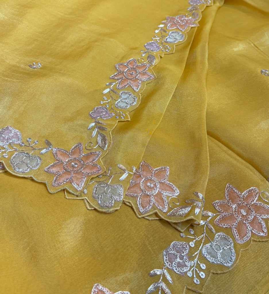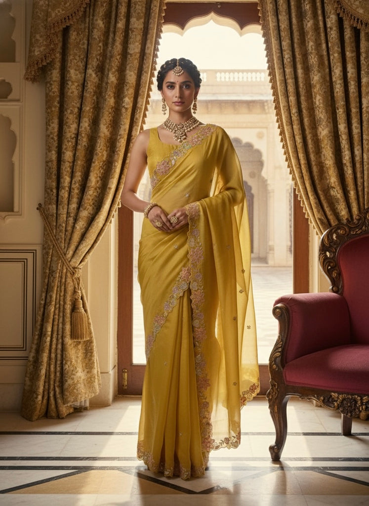 Delicate and luminous, this Yellow Tissue Organza Saree exudes effortless grace. The subtle golden tissue sheen enhances the floral embroidery in silver and pastel tones, making it ideal for daytime festivities, pujas, and summer celebrations.