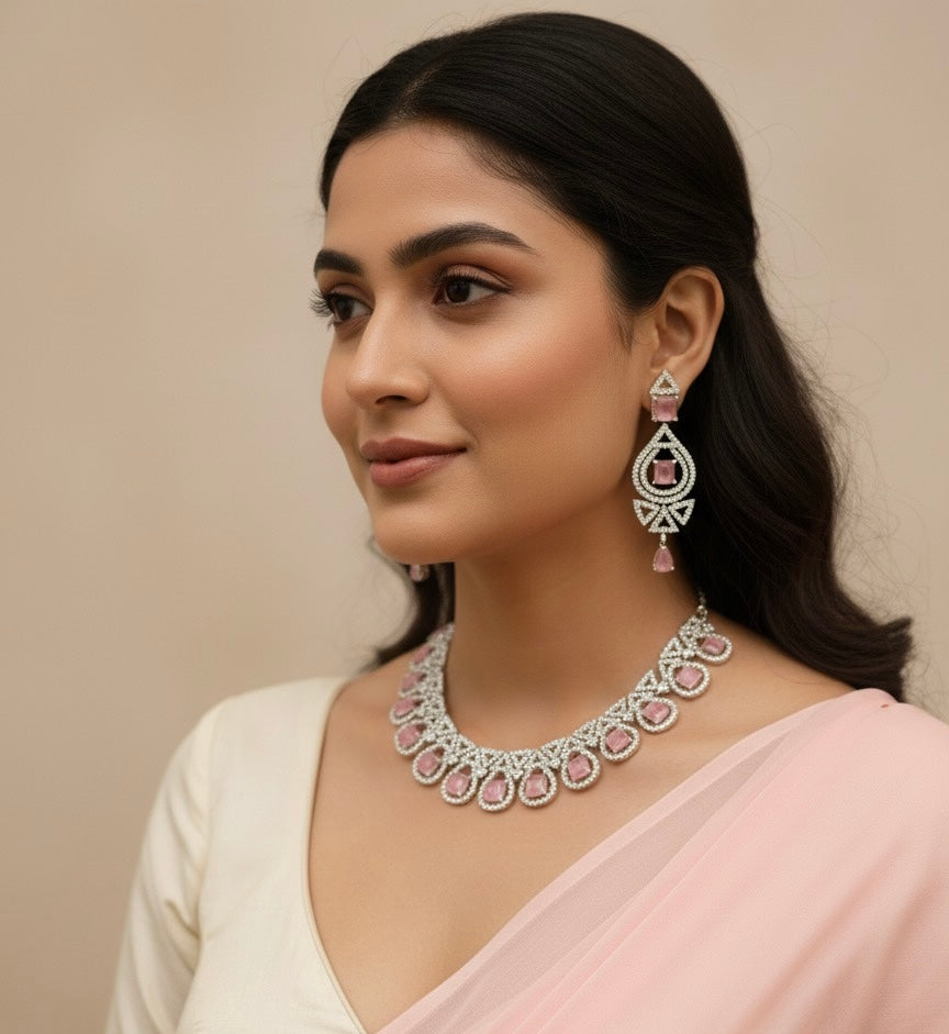 Embrace feminine elegance with this Victorian-inspired baby pink zirconia necklace set with earrings — a graceful choice for weddings, receptions, festive occasions, and parties.