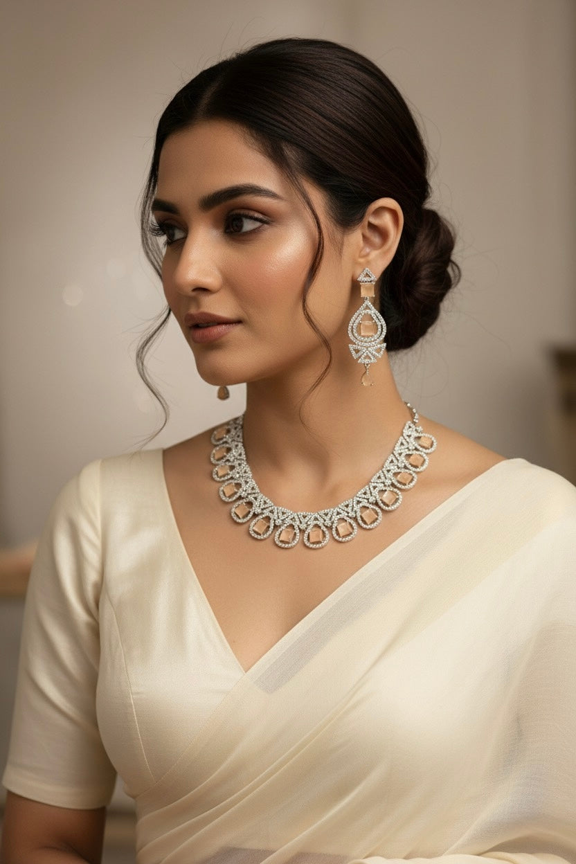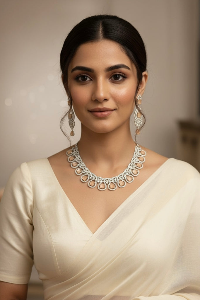 Handcrafted with precision, the necklace features sparkling beige zirconia stones set in an intricate Victorian design. Paired with matching earrings, this coordinated set blends understated elegance with modern charm. Lightweight yet luxurious, it pairs beautifully with sarees, lehengas, gowns, and fusion outfits.
