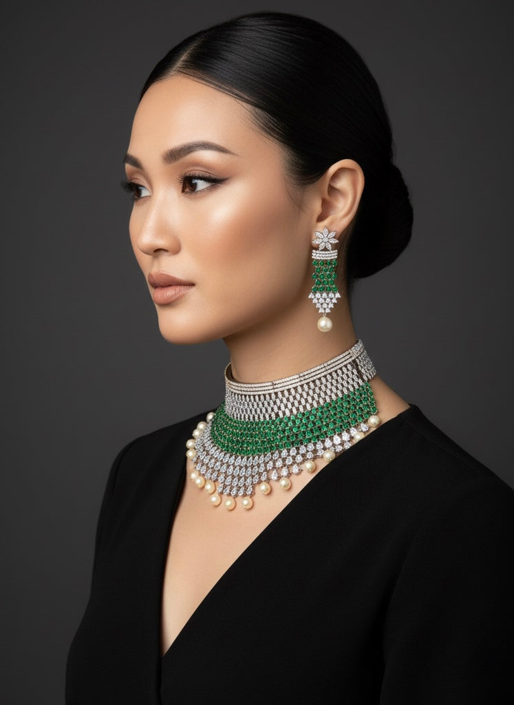Channel timeless elegance with this Victorian-inspired emerald zirconia necklace set with earrings — a stunning choice for weddings, festive occasions, parties, and bridal looks.