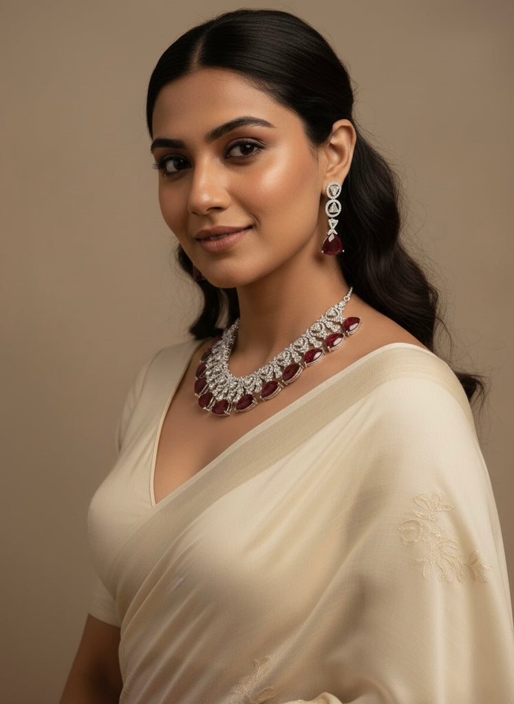 Make a statement with this Victorian-inspired red zirconia necklace set with earrings, crafted in a radiant silver finish. Perfect for weddings, receptions, festive occasions, and bridal celebrations, this jewelry set blends timeless charm with modern sparkle.