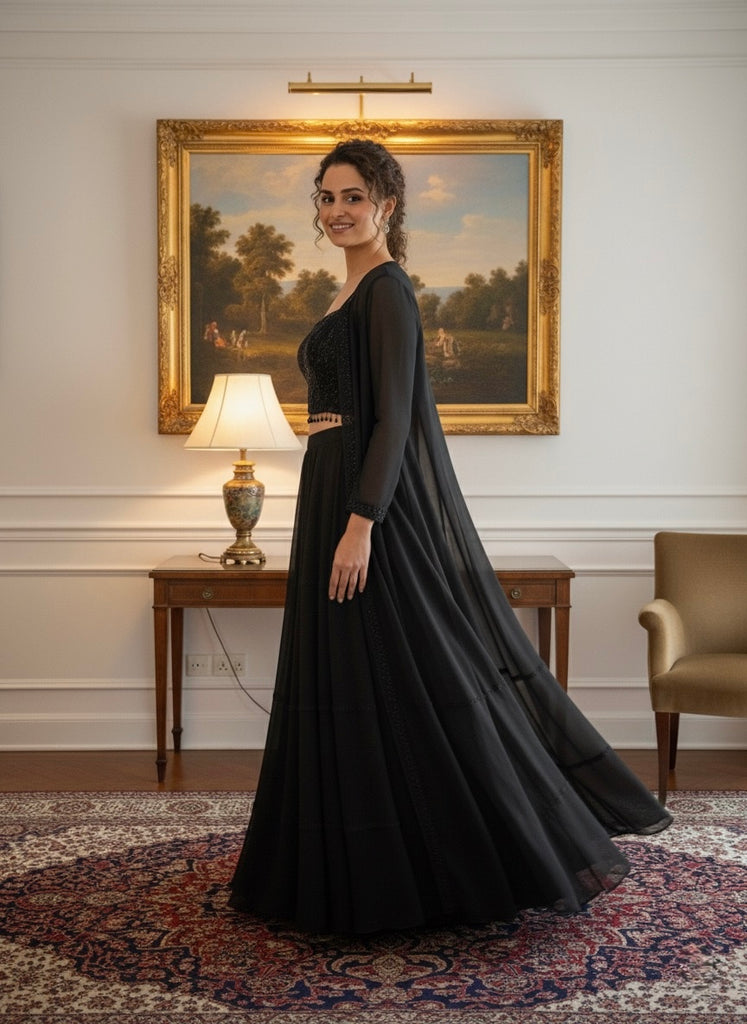 An epitome of modern sophistication, this black three-piece lehenga set is crafted in fluid georgette and beautifully hand-embroidered with Resham threads, beads, pearls, and cutdana. The structured blouse features intricate craftsmanship and a flattering neckline, paired with a flowy skirt that drapes effortlessly. The sheer embroidered jacket adds a contemporary, elevated touch—making it the perfect pick for festive nights, cocktail events, or sangeet celebrations.