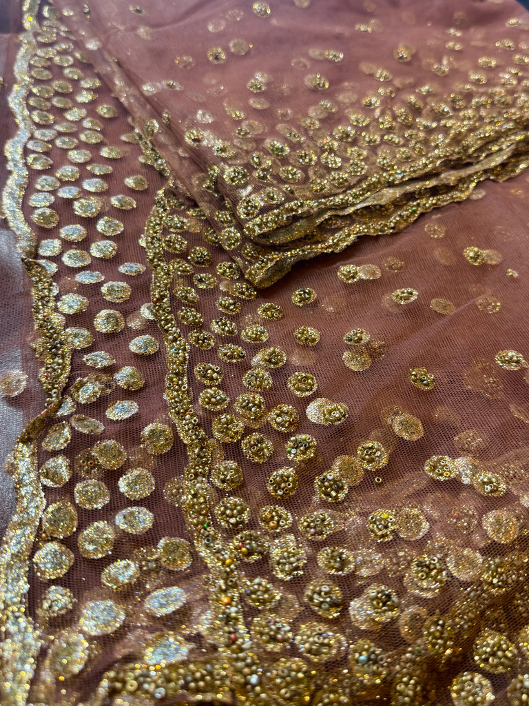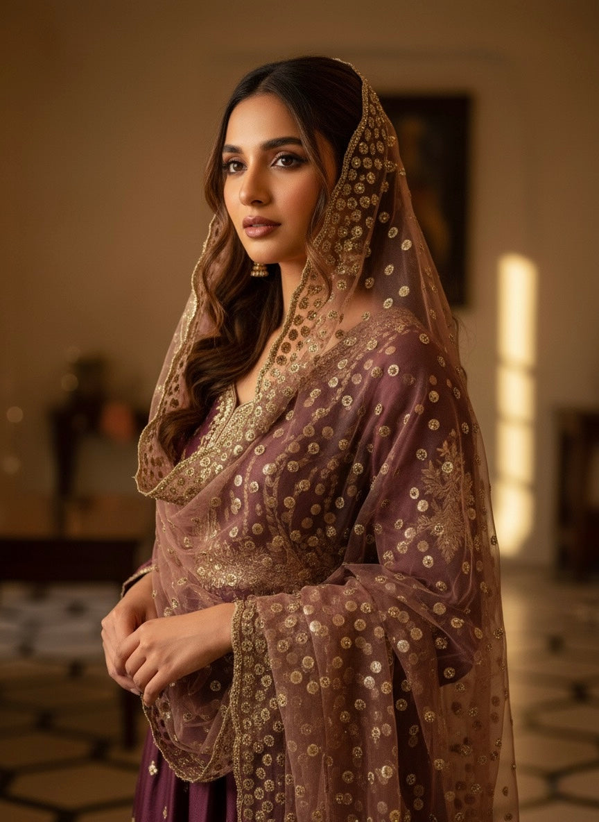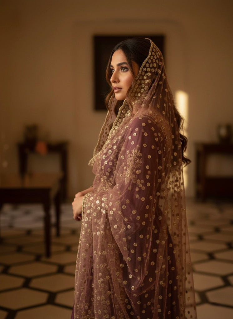 Graceful and understated, this dusty mauve dupatta combines soft romantic tones with intricate sequin detailing. Crafted in sheer net with all-over sequins and a grand embroidered border, it’s a refined accessory for pairing with lehengas, suits, or anarkalis. Ideal for engagements, evening events, and wedding festivities.