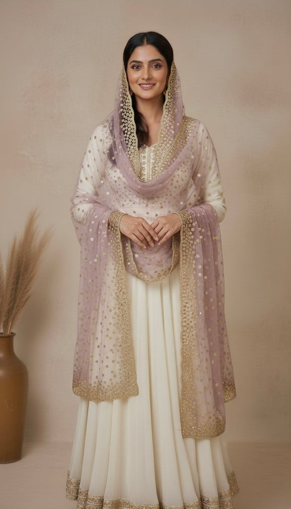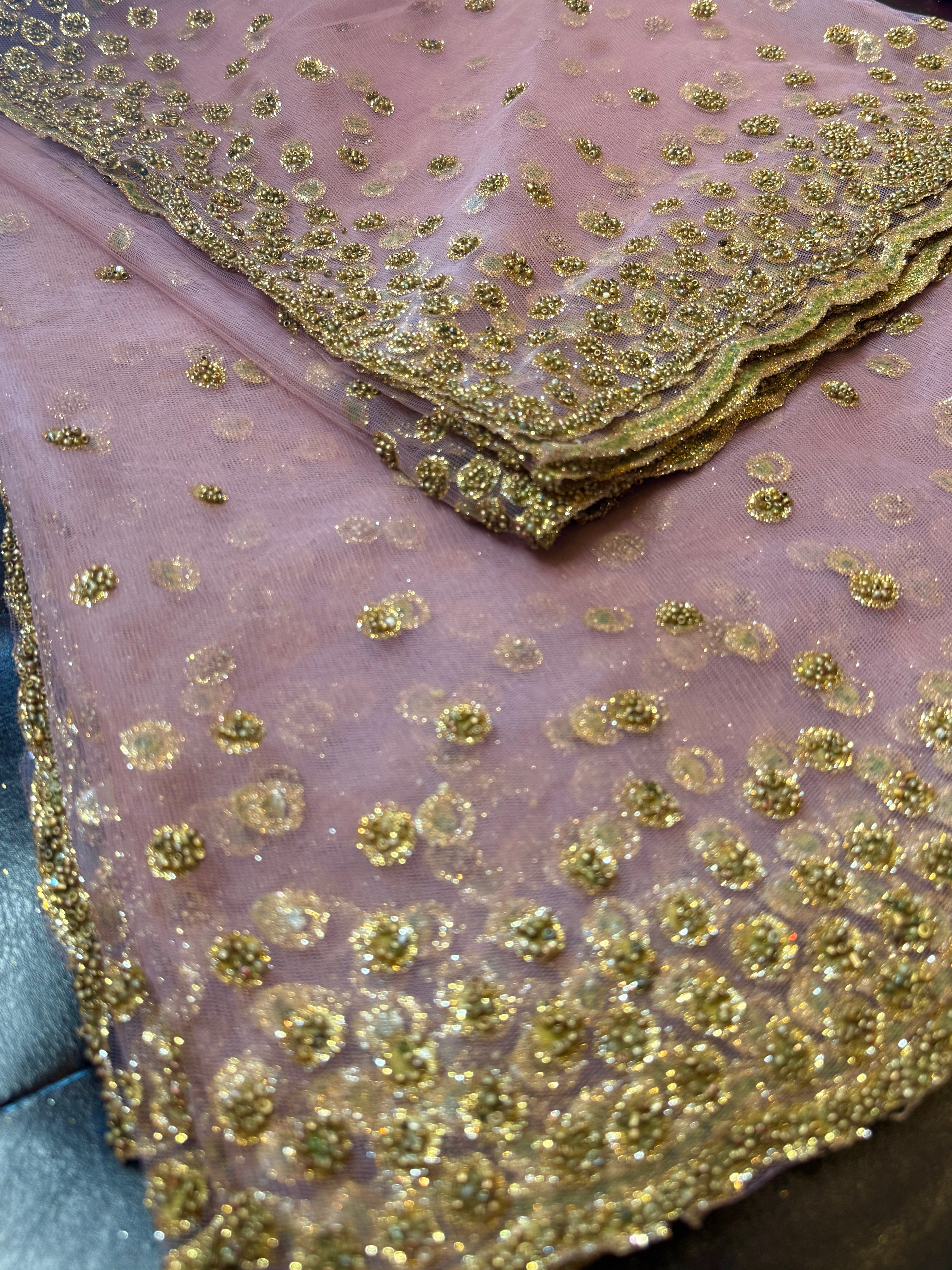 Soft and romantic, this dusty rose net dupatta is detailed with scattered gold sequins and finished with a heavily embroidered border. The muted pink tone makes it versatile for both day and evening wear, pairing beautifully with ivory, pastels, or deeper shades. Elegant yet timeless, it’s perfect for weddings, receptions, and festive gatherings.