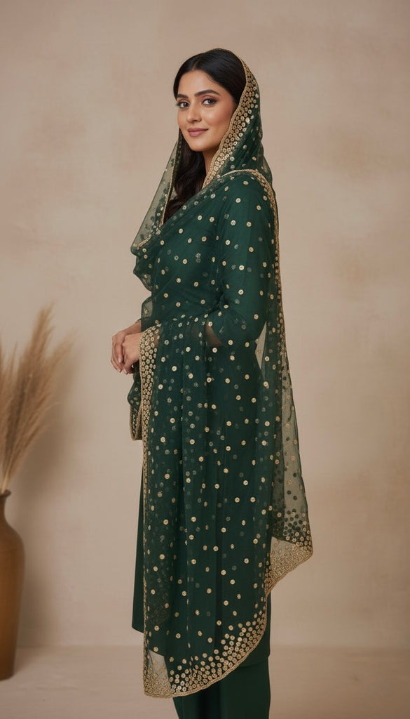 Rich and regal, this emerald green net dupatta is adorned with shimmering all-over sequins and finished with a heavily embroidered sequin border. The jewel-tone shade adds a touch of grandeur to any outfit, making it a versatile statement piece. Perfect for weddings, festive occasions, or evening events, it drapes effortlessly over lehengas, suits, or anarkalis.