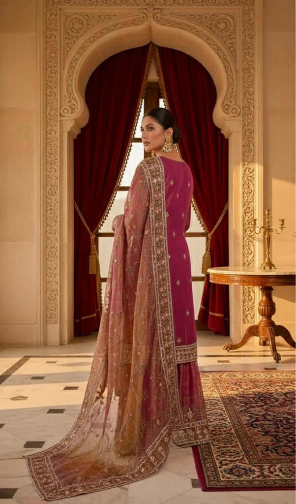 Grace meets grandeur in this mauve hand-embroidered sharara set, crafted to perfection for the modern traditionalist. The straight-cut kurta features intricate zari, resham, and mirror embroidery across the neckline, sleeves, and hemline — creating a rich tapestry of detail. It’s paired with a matching flared sharara, delicately adorned with gold motifs and a heavily embroidered border. The ensemble is completed with a dupatta featuring an ornate handwork border and sequin accents that shimmer with every movement.