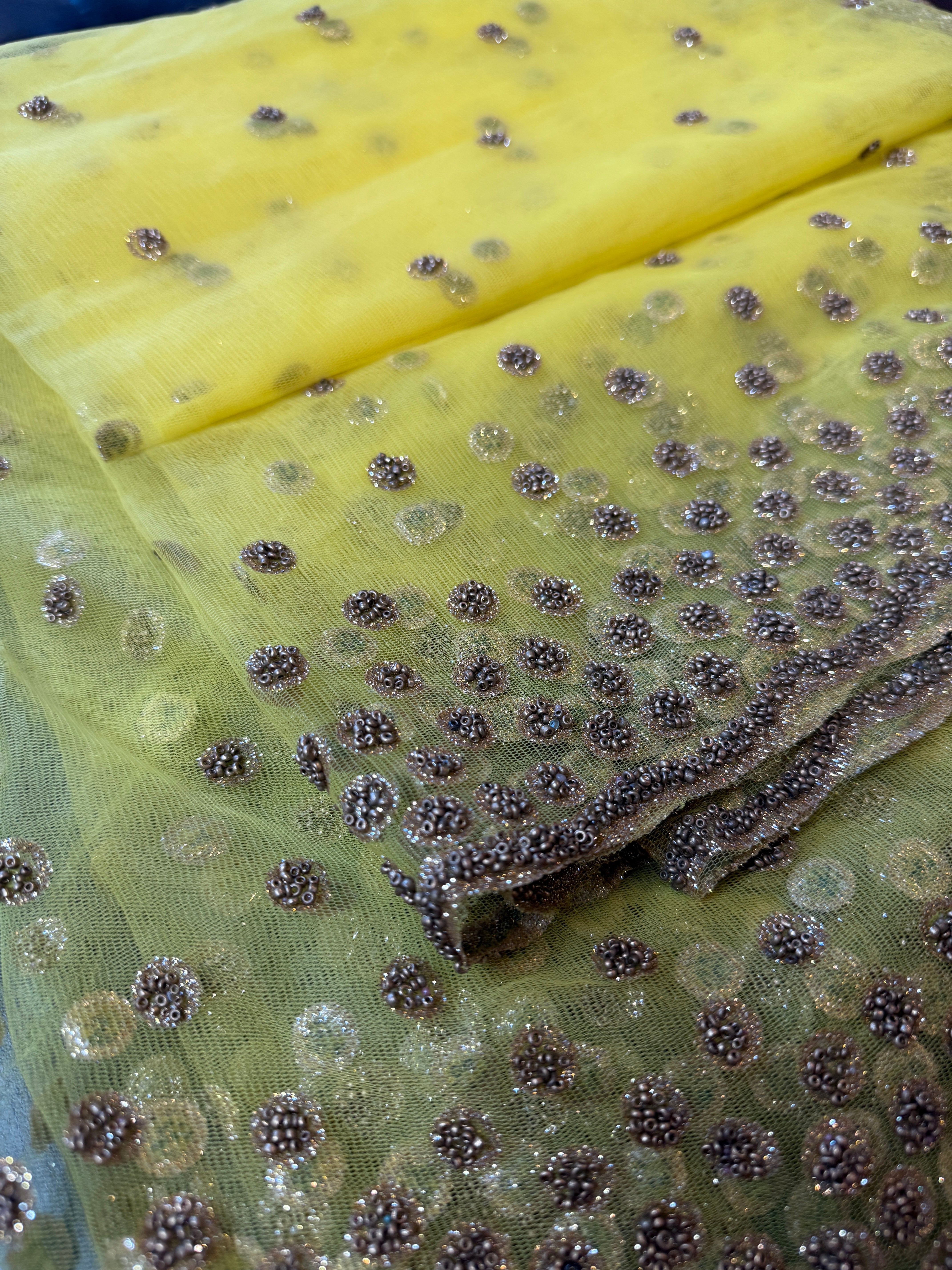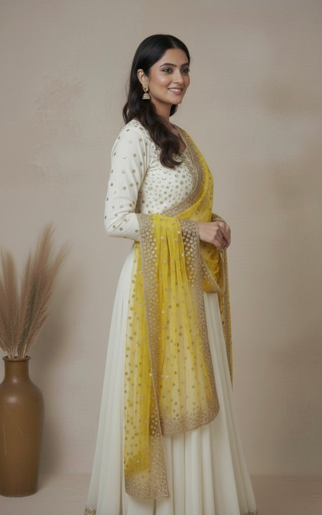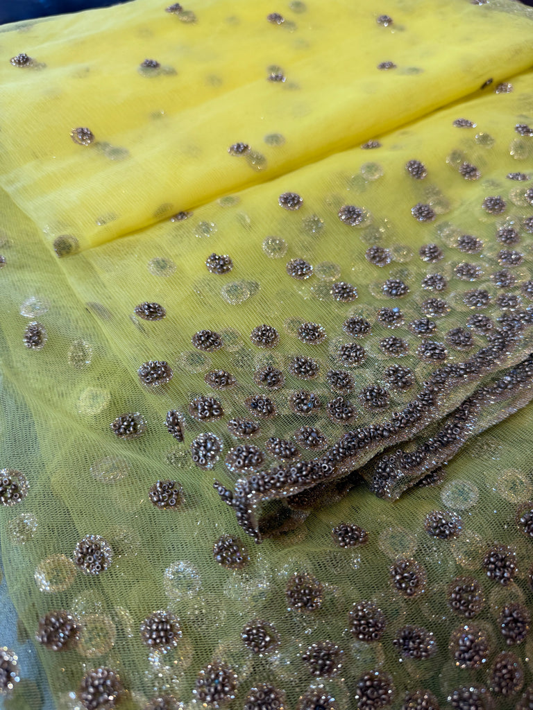 Bright and festive, this sunshine yellow net dupatta is a true statement piece. Adorned with scattered gold sequins that shimmer with every movement, it’s finished with a heavily embroidered sequin border for a touch of grandeur. Lightweight yet luxurious, it drapes effortlessly over suits, lehengas, or anarkalis, instantly elevating your look. Perfect for haldi ceremonies, summer weddings, or festive celebrations, this dupatta adds a radiant charm to any ensemble.