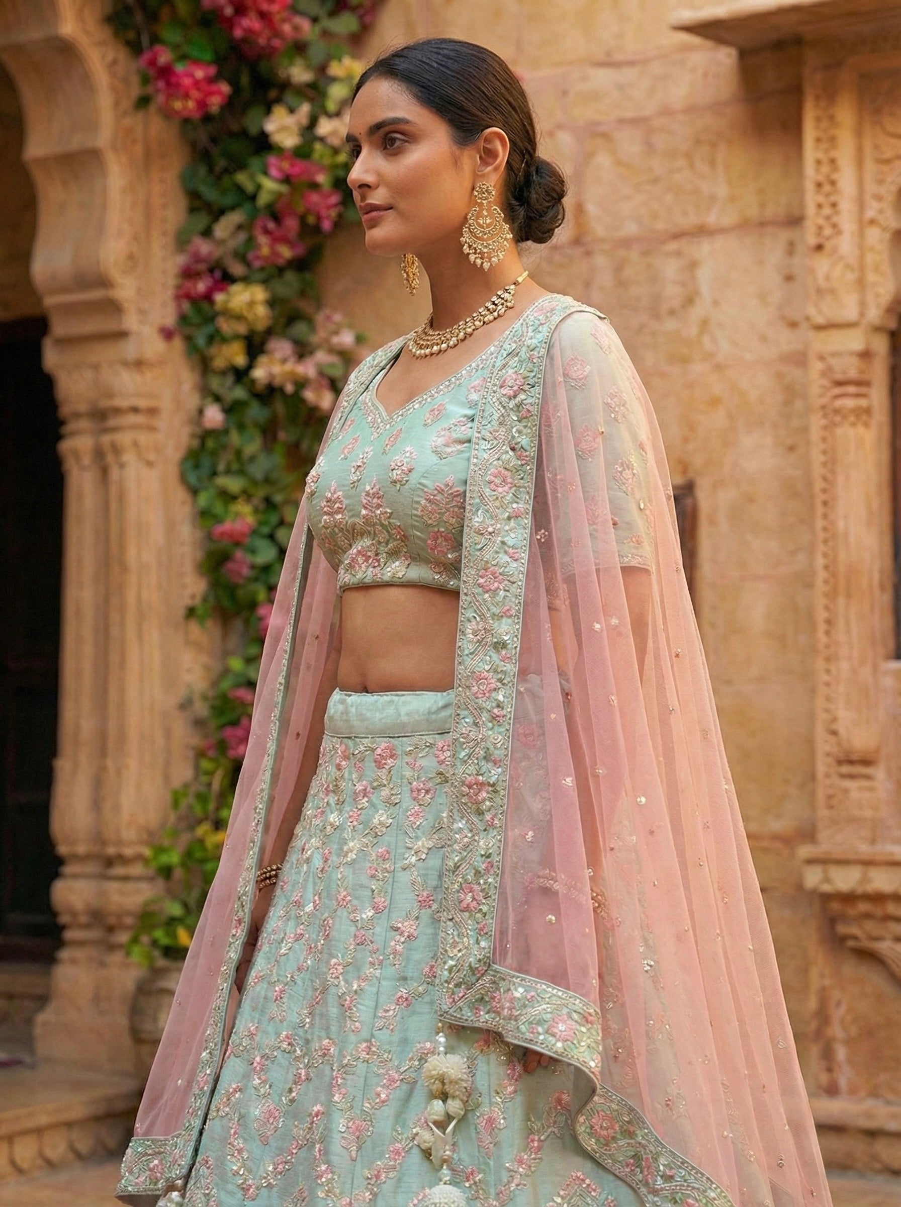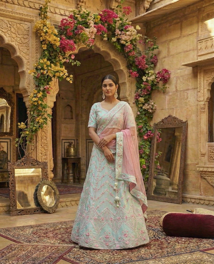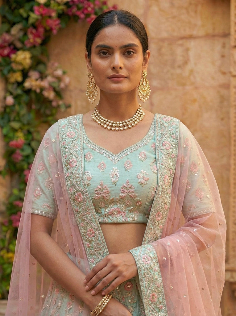 Aahana is a dreamy mint green silk lehenga adorned with delicate pastel pink thread embroidery, sequins, and intricate floral motifs. The skirt features elegant chevron and floral panel work that adds dimension and softness to the silhouette. The matching embroidered blouse is detailed with complementary floral patterns and a flattering V-neckline for a graceful, feminine look. Paired with a blush pink net dupatta embellished with scattered buttas and a beautifully embroidered border, Aahana is the perfect blend of pastel romance and timeless elegance—ideal for daytime weddings, engagements, and spring celebrations.