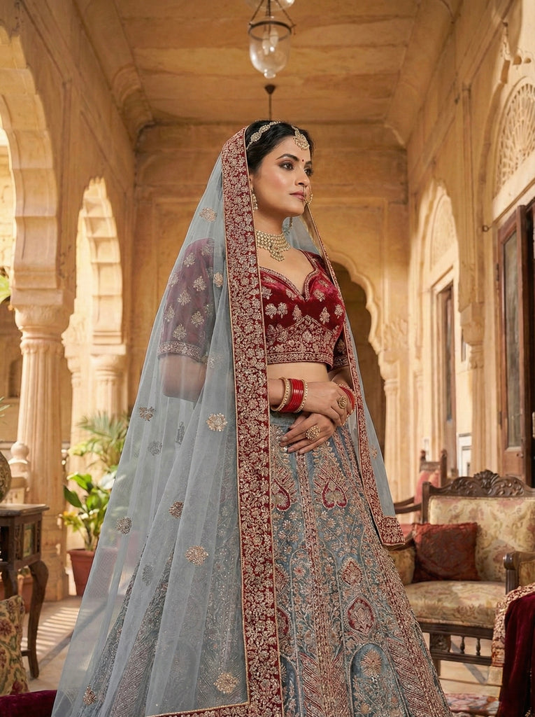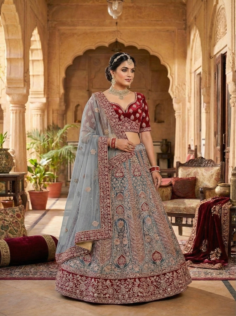 The Samaira Regal Bridal Lehenga is a breathtaking fusion of royal charm and modern bridal elegance. Crafted in a rich combination of deep maroon velvet and powder blue embroidered panels, this couture ensemble embodies timeless sophistication.
