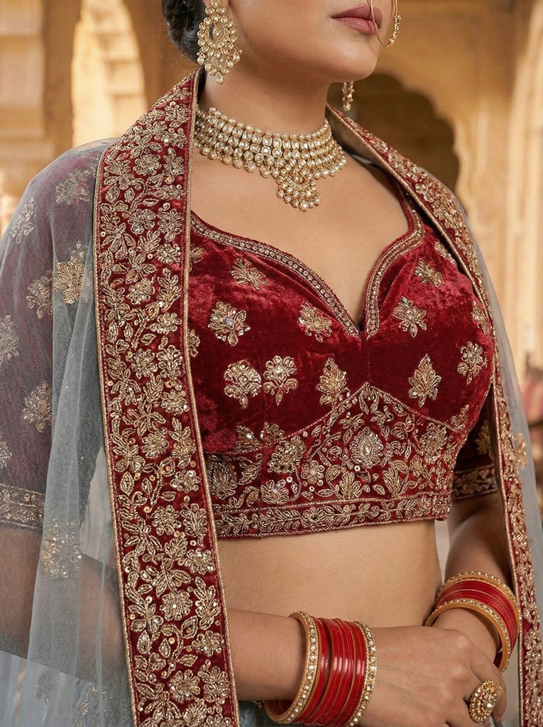 - Blouse: Deep maroon velvet with hand-embroidered motifs and sweetheart neckline